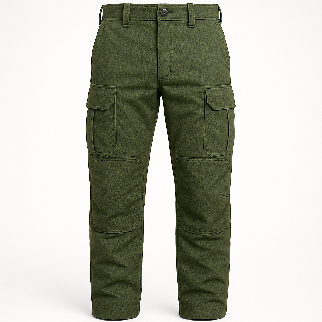 Bolsillos tipo parche con tapa y fuelle a la altura de las rodillas, ideales para equipo adicional.